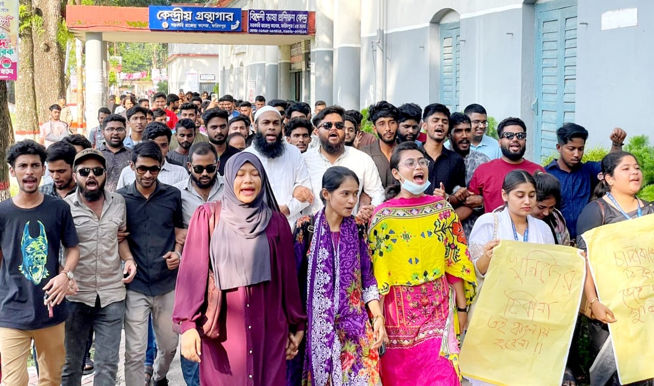 চাঁদাবাজদের বিরুদ্ধে ফরিদপুরে বিক্ষোভ মিছিল ও পথসভা করেছে ছাত্র জনতা