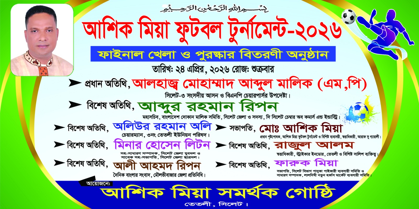 জমকালো আয়োজনে আশিক মিয়া ফুটবল টুর্নামেন্ট-২০২৬ এর ফাইনাল ২৪ এপ্রিল শুক্রবার